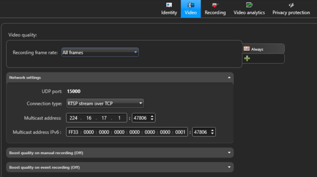- In the left sidebar, select your newly added camera under Archiver and go to the Video tab Network settings select RTSP stream over TCP as the Connection type.