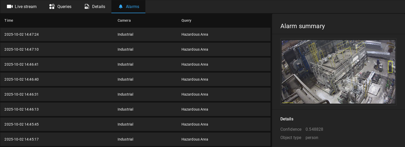 Queries run on live streams produce alarms when a detection is made. Alarms can be continually monitored and reviewed in the Alarms view.